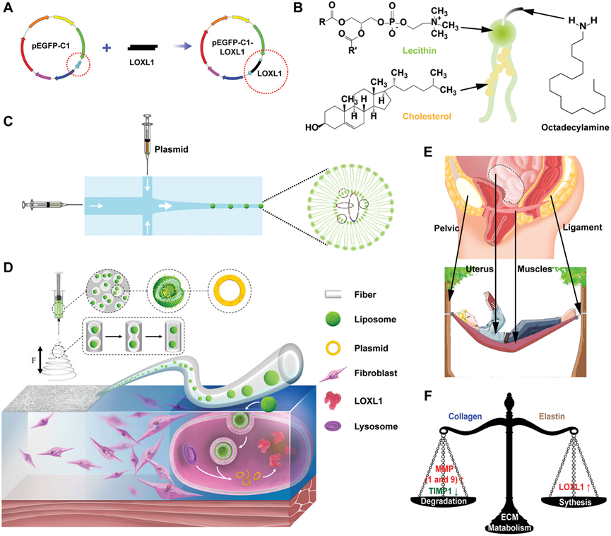 金晶等通过微溶胶静电纺丝技术构建了一种可以将遗传物质传递到活组织的高效电纺纤维系统。此递送系统装载pLOXL1,可以促进胶原蛋白和弹性蛋白的合成。弹性蛋白还可以长期增强纤维的交联性,以维持ECM中降解与重塑之间的平衡。从而促进骨盆底组织的修复并恢复骨盆底的结构支撑。