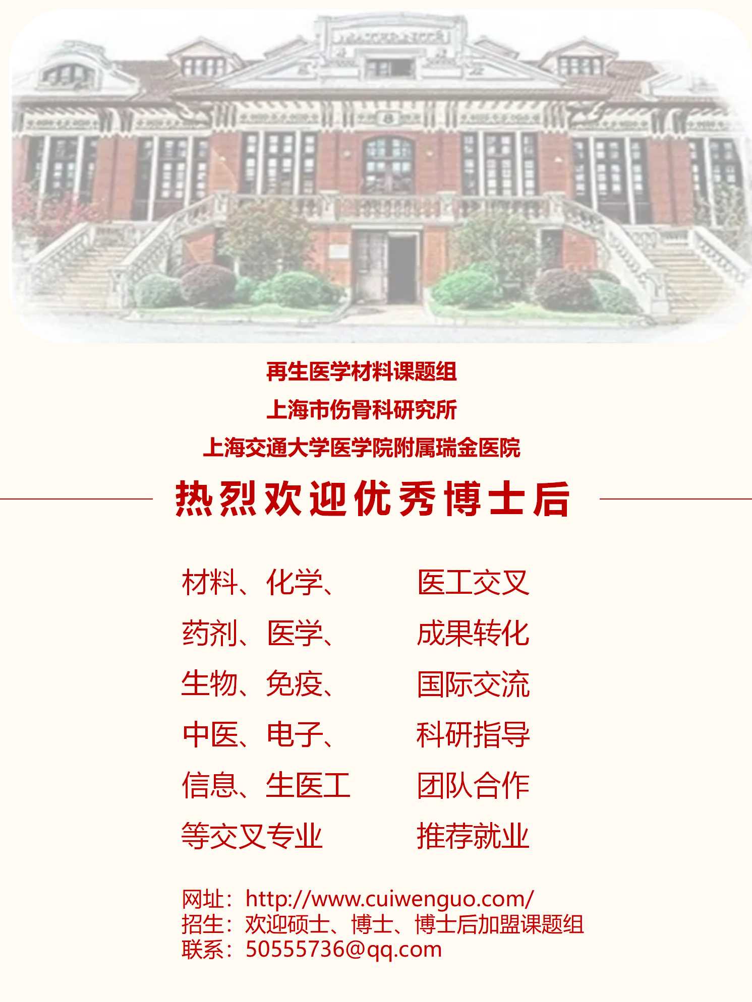 获得生物材料、药学/剂、化学、生物医学工程、生物学、高分子、骨科、伤科、中西医结合、免疫学等相关专业博士学位;
