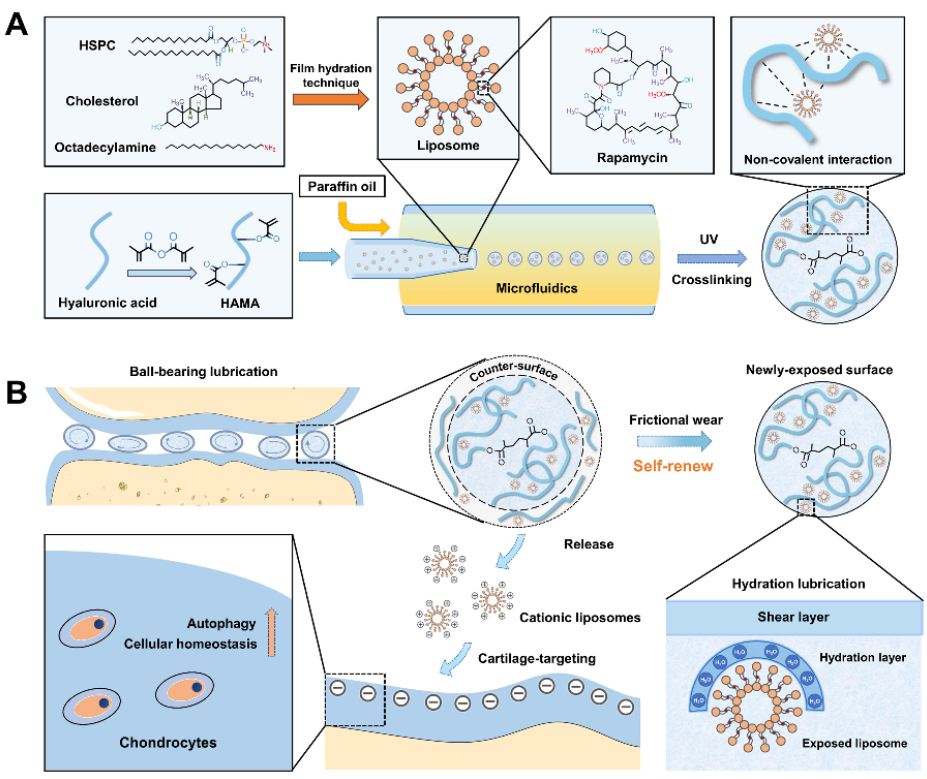 雷一霆和王雨平博士生等在Science Advances上在线报道了他们的研究技术——“自更新水合润滑载药水凝胶微球 Injectable hydrogel microspheres with self-renewable hydration layers alleviate osteoarthritis,用于治疗骨关节炎。该研究团队将负载雷帕霉素(RAPA)的阳离子脂质体与甲基丙烯酸化透明质酸(HAMA)进行混合,进一步通过微流控技术和光引发的自由基聚合反应,创新性地制备出兼具“自更新”水合润滑功能和维持细胞稳态作用的可注射脂基-水凝胶微球,并用于骨关节炎软骨损伤修复。