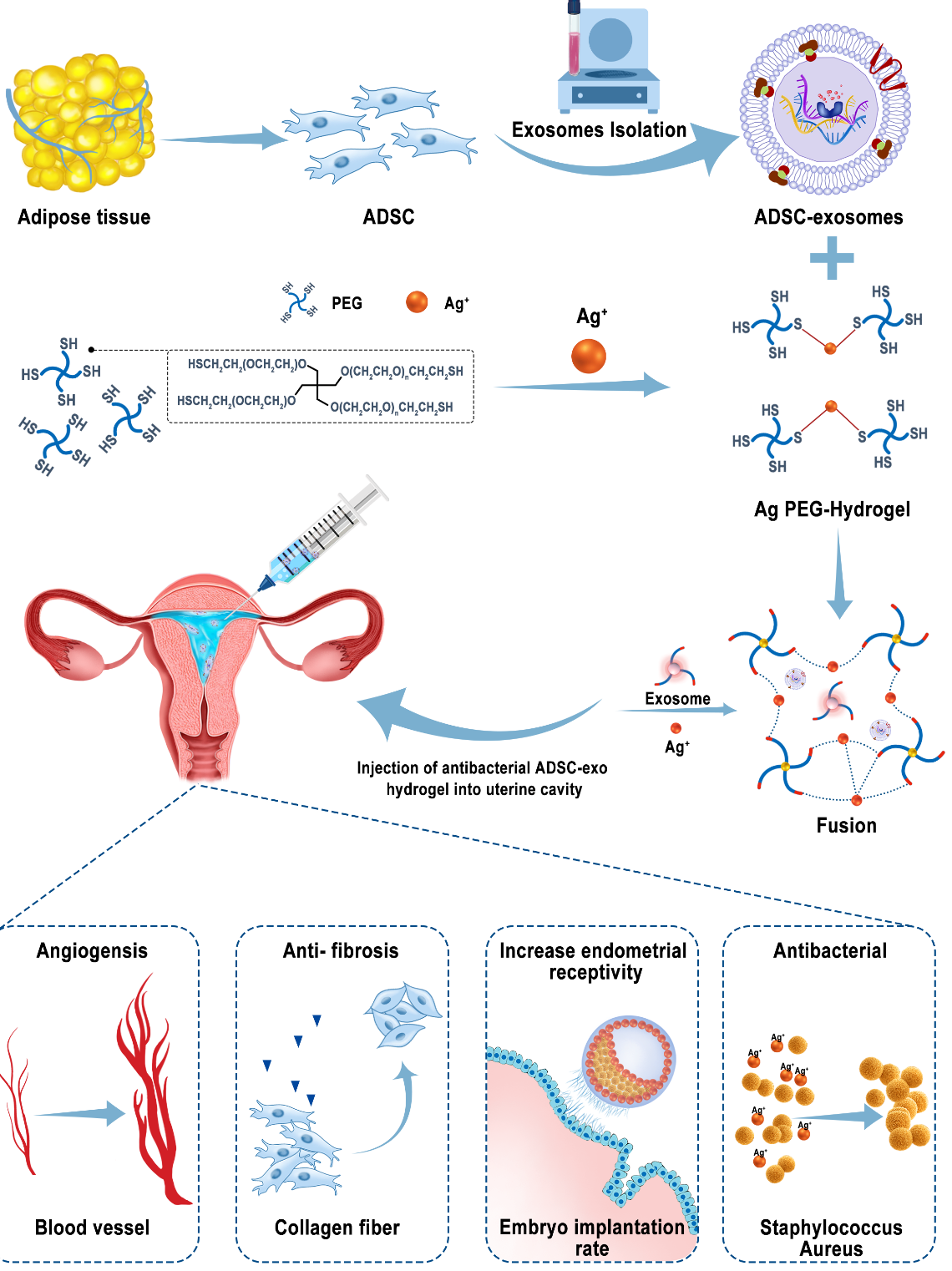 王臻博士生等通过构建了一种可微创注射的外泌体-水凝胶微环境体系,用以促进子宫内膜血管新生,抑制纤维化,高效促进内膜再生并提高子宫内膜容受性,损伤后修复的大鼠子宫能妊娠并分娩正常的新生大鼠。因此,具有微创可注射的外泌体-水凝胶微环境体系能促进损伤后子宫内膜的组织结构和功能的恢复。
