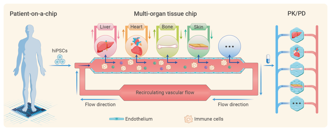 基于hiPSCs在类器官和组织芯片这一领域的最新进展,使用同一患者的细胞诱导的单器官或多器官芯片系统可以被用作个性化的活体化身,通过外接血流进行器官-器官交流的同时,借助内皮屏障提供各器官特定的生长环境,从而在体外长期培养过程中维持各个器官表型稳定性,有效再现体内PK/PD模型。血管连接和表型稳定的成熟人体组织芯片系统可以为患者提供个性化的诊疗方案,从而为精准医学开辟新的道路。