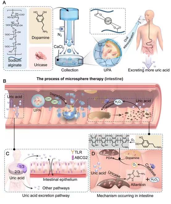 汤云开博士生等通过气流控和离子交联技术构建负载尿酸酶的肠道“爆破”口服水凝胶微球,通过水凝胶微球实现肠道黏膜原位固定尿酸酶,分解局部尿酸,从而增加肠道内外的尿酸浓度差,进一步激活尿酸转运蛋白上调,少量尿酸酶即可上调肠道上皮细胞的尿酸转运蛋白表达,提升了将上皮细胞内的尿酸排出到肠道内的能力,为痛风的防治提供新治疗策略。
