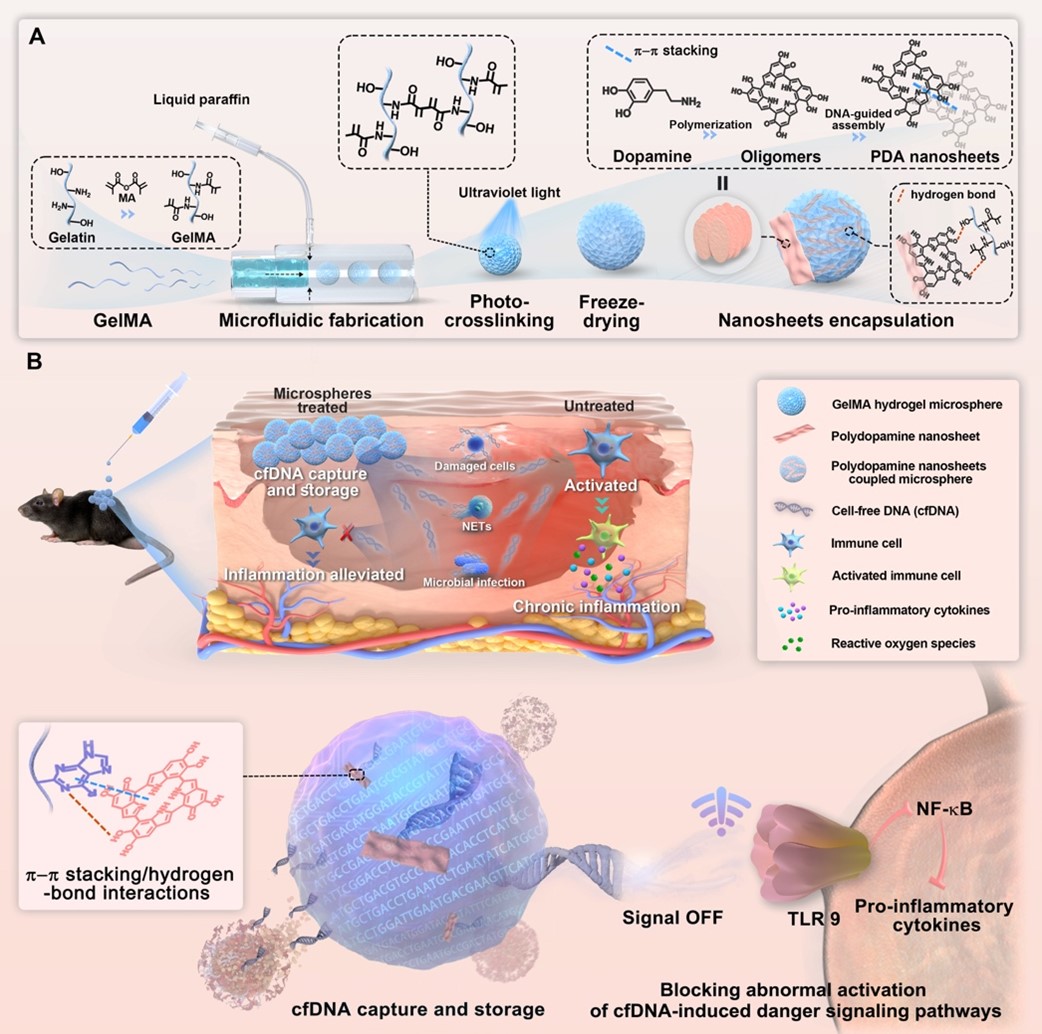 丁涛博士等利用导向自组装和微流控技术构建负载聚多巴胺纳米片的甲基丙烯酸化明胶(GelMA)水凝胶微球。创新地利用聚多巴胺纳米片与游离DNA碱基结构之间的π-π堆积/氢键作用实现游离DNA的捕获,进一步地通过水凝胶聚合物网络形成的限域空间实现游离DNA的存储,以此阻止病灶部位游离DNA与免疫细胞之间的恶性互作,从而缓解慢性炎症,为生物材料-炎性介质之间的相互作用调控策略提供新思路。