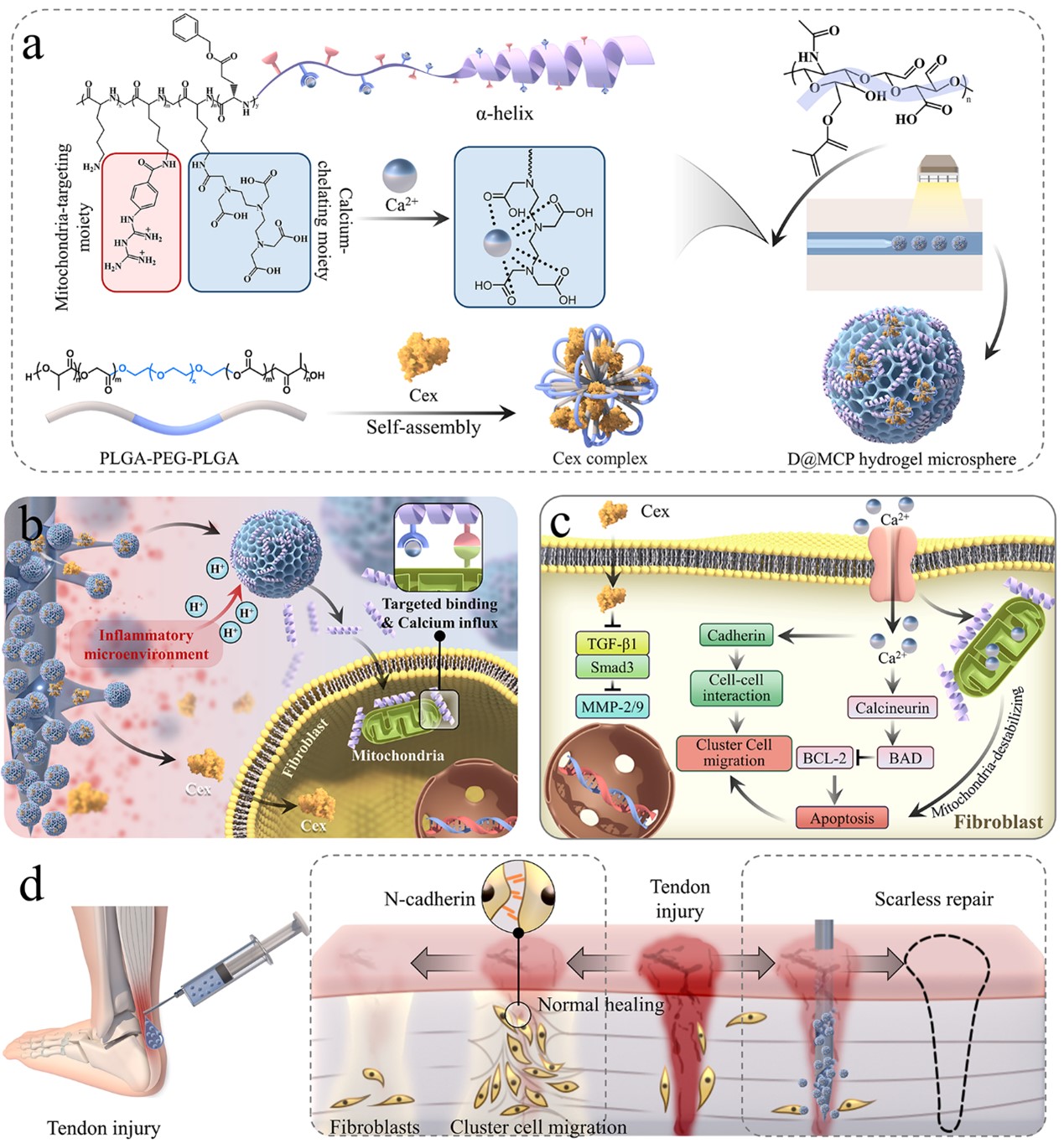 庄亚平老师等采用α-氨基酸-N-羧酸酐(NCAs)和交酯分别开环聚合制备了α-螺旋聚多肽纳米粒子和抗炎胶束,并通过微流控技术构建了微点生物材料体系。通过在炎症环境中缓慢释放靶向线粒体的功能化聚多肽,携细胞外钙离子内流,从而抑制介导细胞间相互作用的N-钙粘蛋白的表达,促进集群成纤维细胞的凋亡,协同抑制集群成纤维细胞在肌腱损伤部位的迁移。同时,由PEG/聚酯纳米胶束增溶的抗炎药物可长效改善损伤部位的炎性微环境。该微点生物材料为损伤部位瘢痕粘连的抑制开辟了新方法。