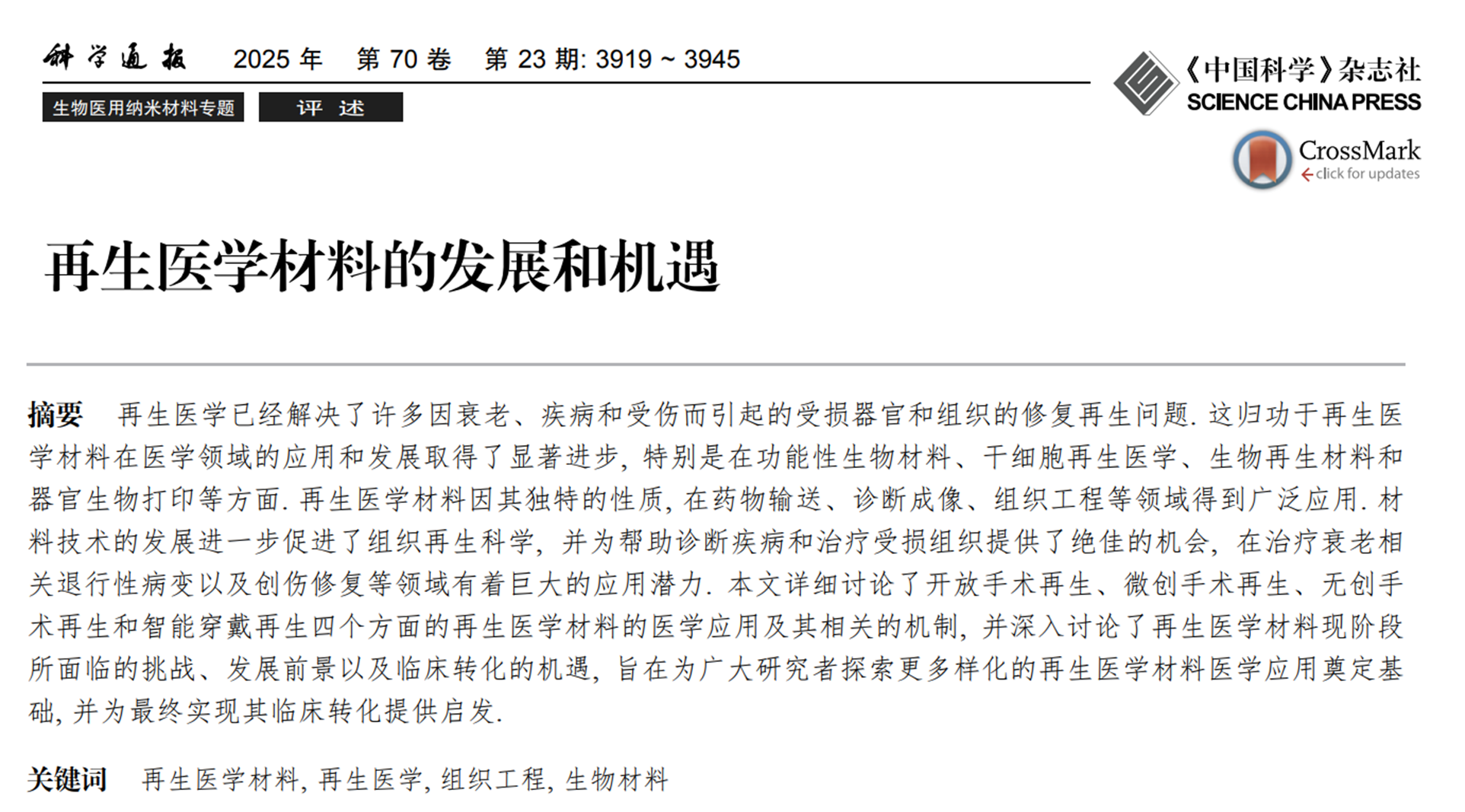 近日,汤云开同学在科学通报杂志上发表了一篇题为“再生医学材料的发展和机遇”的综述。文章详细讨论了开放手术再生、微创手术再生、无创手术再生和智能穿戴再生四个方面的再生医学材料的医学应用及其相关的机制,并深入讨论了再生医学材料现阶段所面临的挑战、发展前景以及临床转化的机遇,旨在为广大研究者探索更多样化的再生医学材料医学应用奠定基础,并为最终实现其临床转化提供启发。