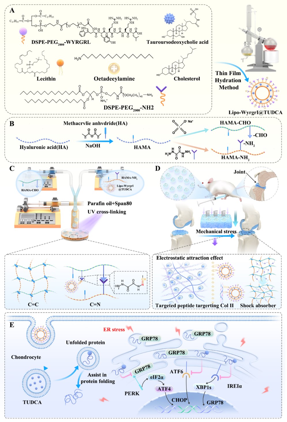 为解决上述难题,本研究提出“细胞减震器”策略,构建具有应力松弛特性的双动态交联水凝胶微球(Stress-relaxed HAMA@Lip)。该微球由醛基修饰透明质酸(HAMA-CHO)与肼基修饰透明质酸(HAMA-NH₂)通过亚胺键动态交联制备而成,通过微流控技术构筑尺寸均一、可注射的球形水凝胶结构。其内部进一步嵌入负载TUDCA的靶向脂质体(Lipo-WYRGRL@TUDCA),实现机械耗能与内质网应激缓解的双重功能。在应力松弛性能测试中,该微球展现出与天然软骨相近的松弛行为,有效吸收并耗散外力传导;在体外OA模型中显著下调ERS相关标志物(Grp78、CHOP等),保护线粒体功能,延缓软骨细胞衰亡。在大鼠OA模型中,微球可实现关节腔内注射后长期驻留,抑制软骨退变、减缓骨破坏,具有优异的体内治疗效果。本研究首次将应力松弛设计引入OA微环境干预中,为构建“力学缓冲+药物递送”一体化生物材料提供了新思路,也为骨关节炎等力学相关退行性疾病的治疗策略拓展了新方向。