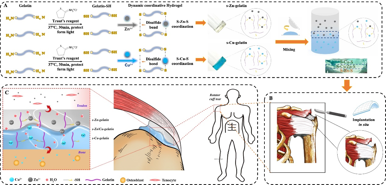 图1.双金属离子梯度水凝胶的构建过程及其促进肩袖腱骨组织愈合